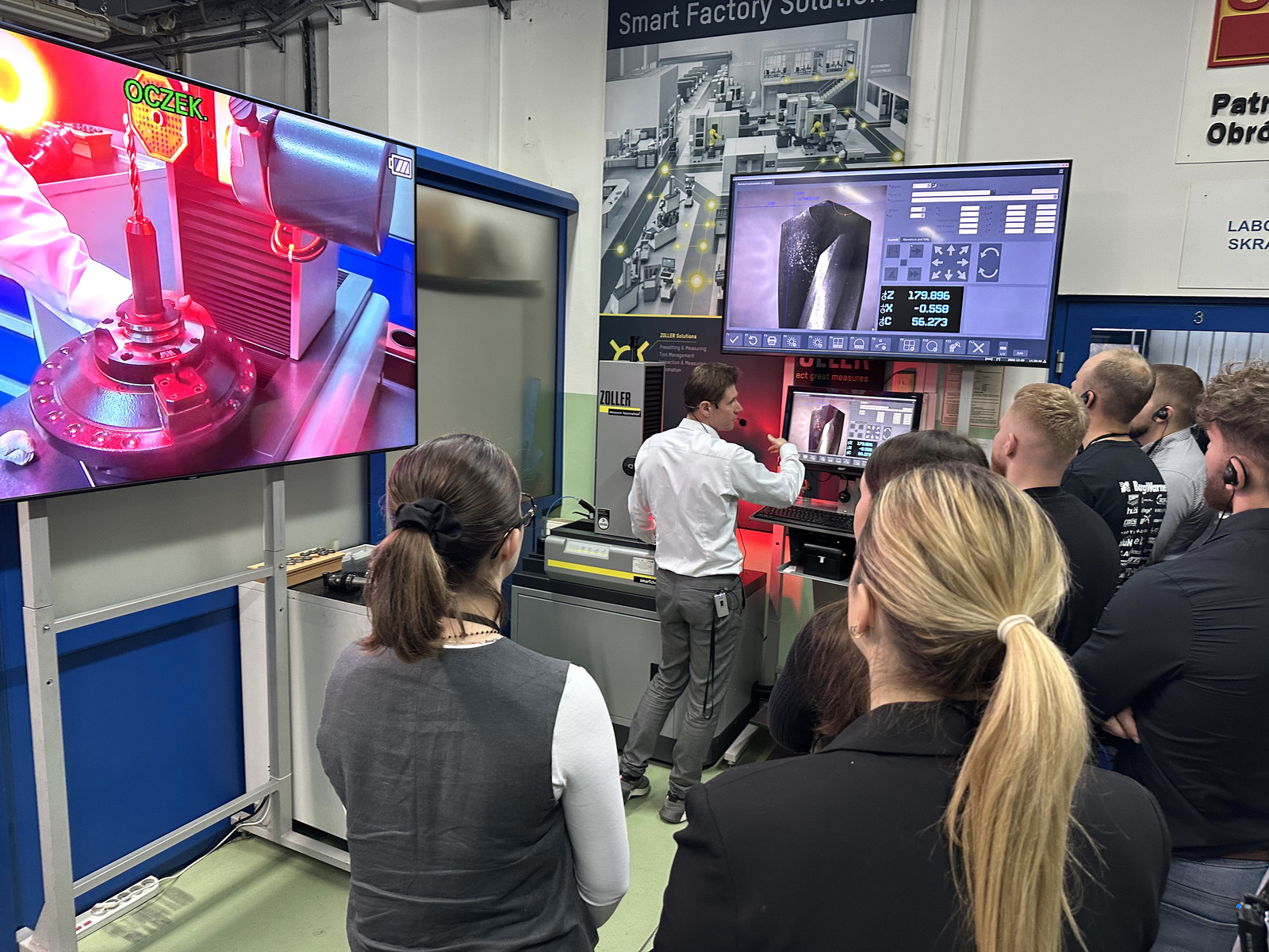• pokazy automatycznego przesyłu danych narzędziowych bezpośrednio do obrabiarek CNC stanowiące integralny element zajęć demonstracyjnych i były realizowane z wykorzystaniem nowo wdrożonego w katedrze rozwiązania ZOLLER zidCode – przykłady przeprowadzono z zastosowaniem kodów QR, dedykowanego czytnika QR i systemu RunMyVirtualMachine, demonstrując praktyczne możliwości cyfrowej integracji systemów pomiarowych z procesami przygotowania i realizacji produkcji.