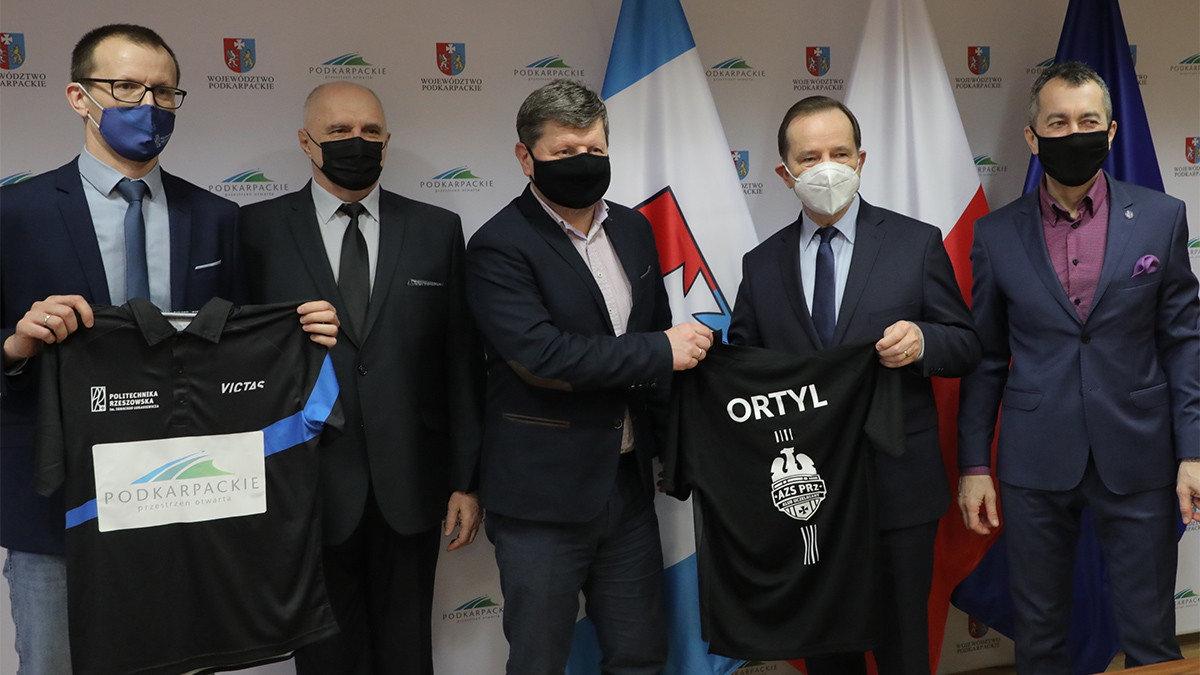 W spotkaniu uczestniczyli: marszałek województwa podkarpackiego Władysław Ortyl, rektor Politechniki Rzeszowskiej prof. dr hab. inż. Piotr Koszelnik, prorektor ds. studenckich prof. dr hab. Grzegorz Ostasz, dyrektor Centrum Sportu Akademickiego PRz Jerzy Pająk oraz jego zastępca Grzegorz Sowa.